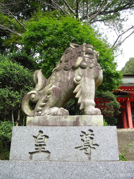 石段の左右には立派な狛犬。台座には「皇尊」の文字。