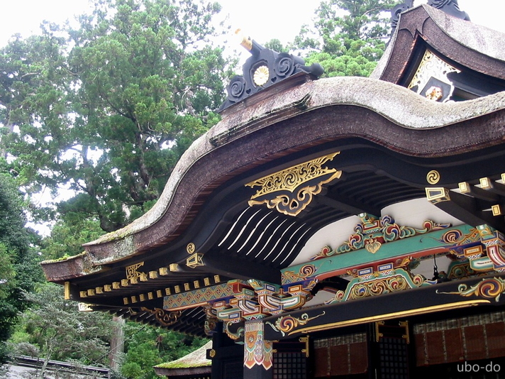 朱塗りの楼門は見栄えがよく実に見事。元禄13年(1700)に本殿と共に徳川綱吉により造営された。楼上の額は東郷平八郎の筆。