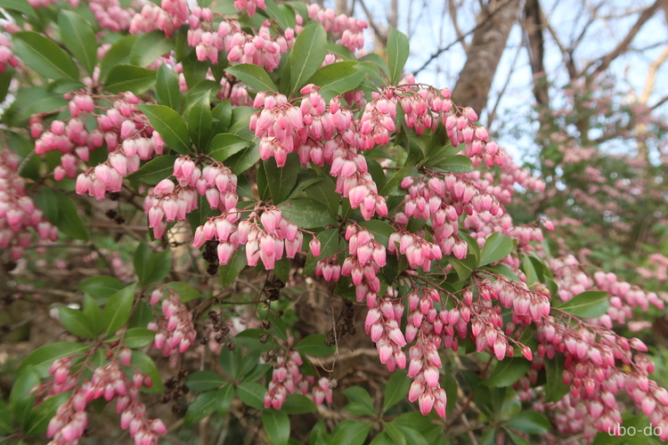 ルリタテハやテングチョウなど多くの蝶が、ベンチ横に咲いていたアセビの蜜を吸っていた。