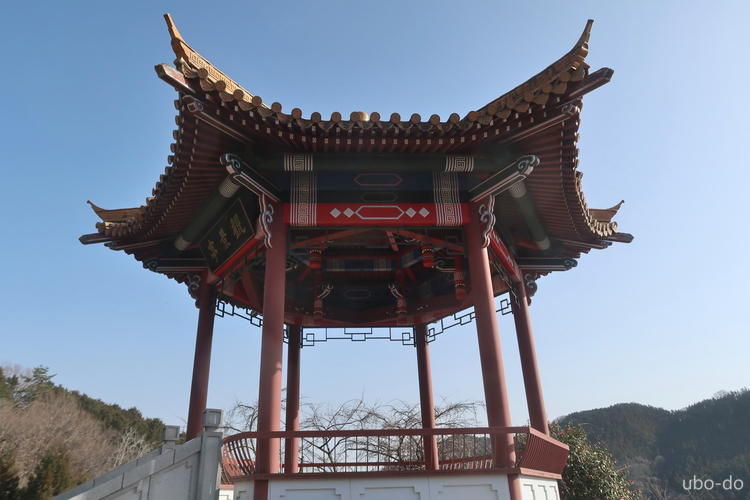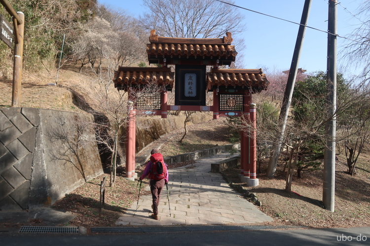 花菖蒲園の向かいにある「友好之林」と書かれた中華風の鳥居。ここが鳥居コースの入口となる。