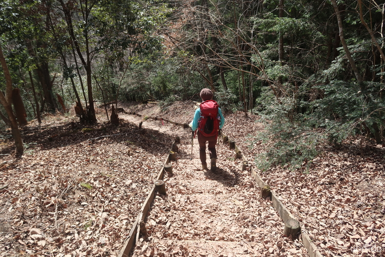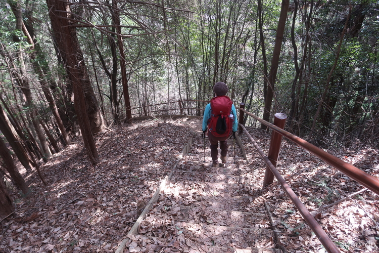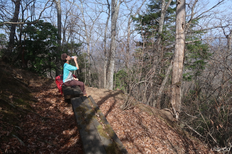 山頂下のベンチでひと休み。おにぎりを食べて休憩した。