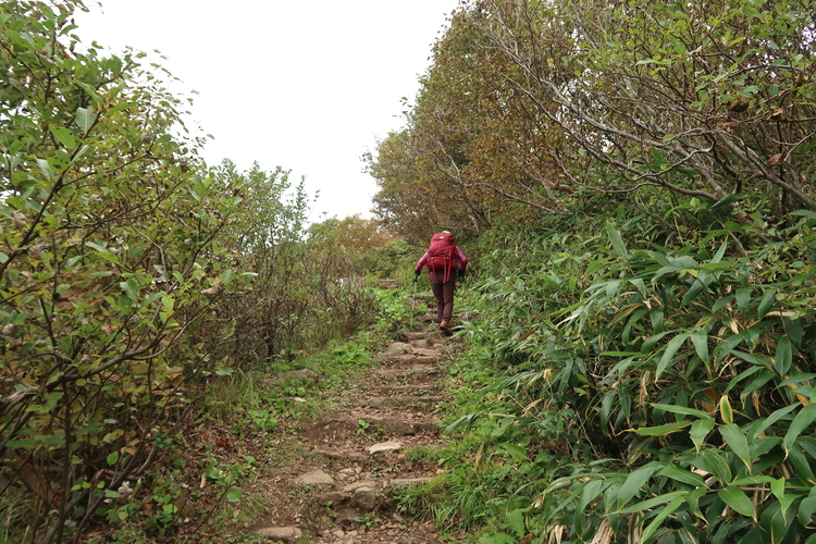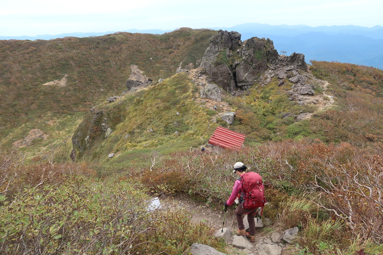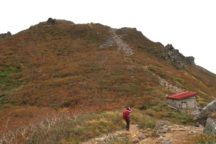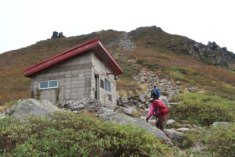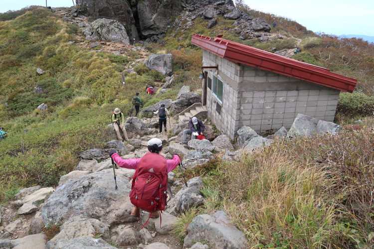 無人の避難小屋である鳳鳴ヒュッテを通過。1964年1月、秋田県立大館鳳鳴高校・山岳部の生徒5名が下山途中に遭難、うち4名が亡くなるという事故があり、避難小屋はそれを受けて建てられた。