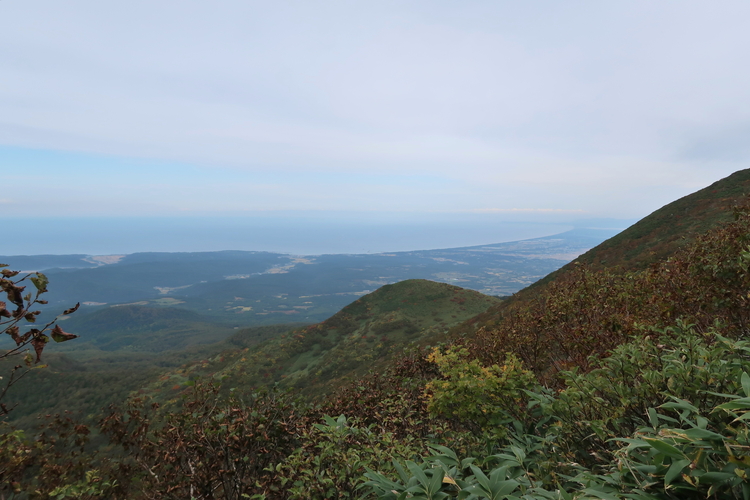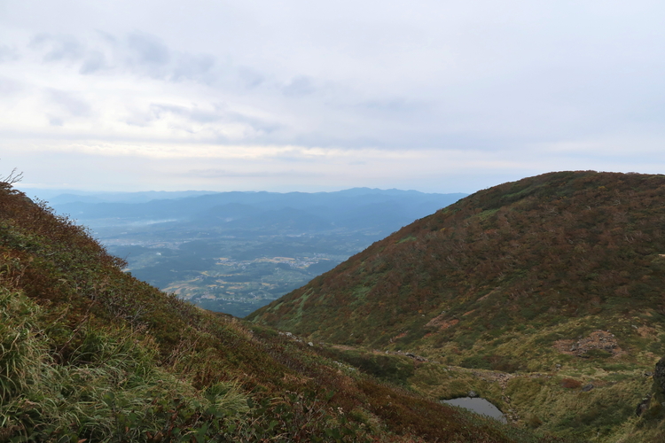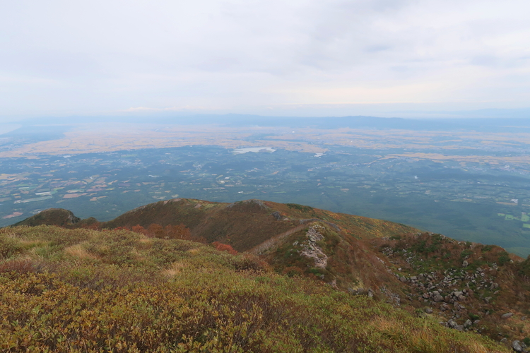 途中で振り返ると、鳥海山の左、南側に弘前市が見えた。手前の鳥ノ海噴火口に、沼の一部が見えていると後で気がついた。