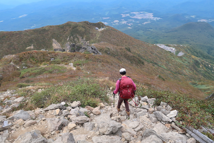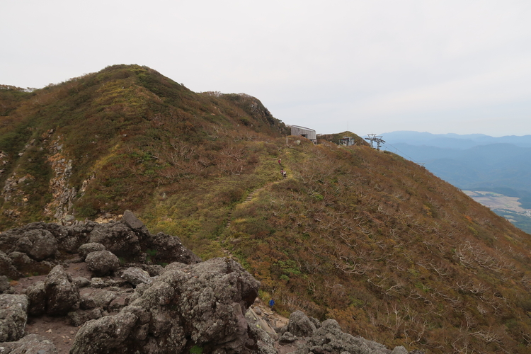 眼下にリフト乗り場と8合目駐車場を眺めながら岩ゴロの急坂を下る。