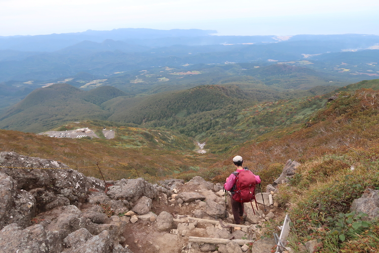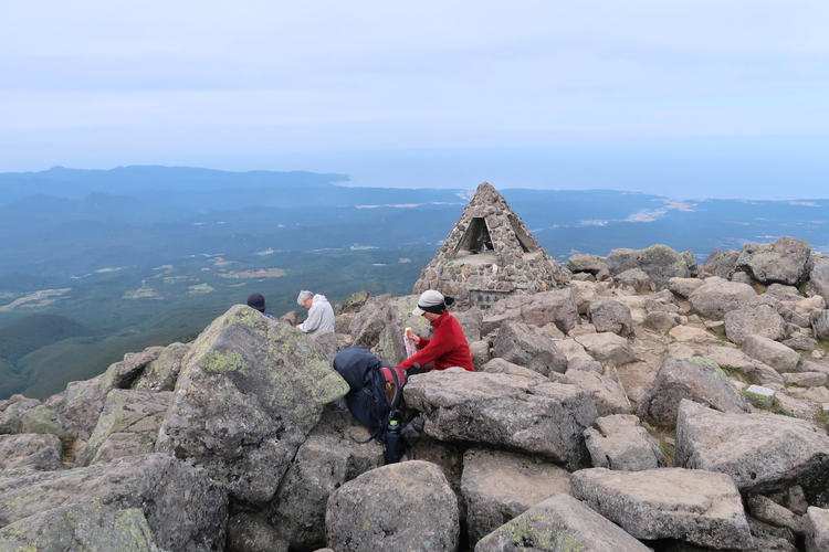 前夜は百沢の「やすらぎの駐車帯」で車中泊。6時に起床して、まずは岩木山神社で早朝参拝を済ませた。いったん駐車場に戻り、津軽岩木スカイラインが開くのを待って岩木山の8合目へ移動した。予報どおりのくもり空で、雨に降られることも覚悟していたが、思った以上に遠望が利いて、山頂から360度の大展望を楽しめた。下りでは修学旅行の集団とすれ違ったが、リフト分岐から上は、上りと下りのルートが分かれているところが多いので、ストレスなく下山することができた。