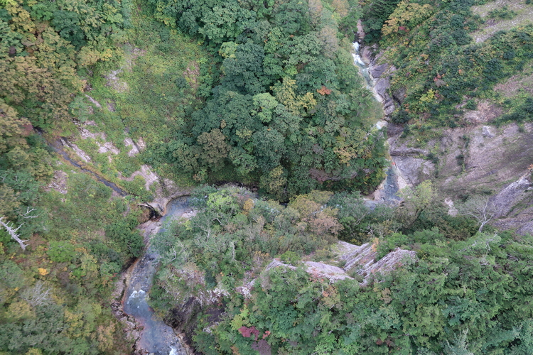 断崖絶壁で知られる城ヶ倉渓流にかかる城ヶ倉大橋は、アーチ支間長が255mと、上路式のアーチ橋では日本一の長さを誇り、谷底からの高さは122mもある。