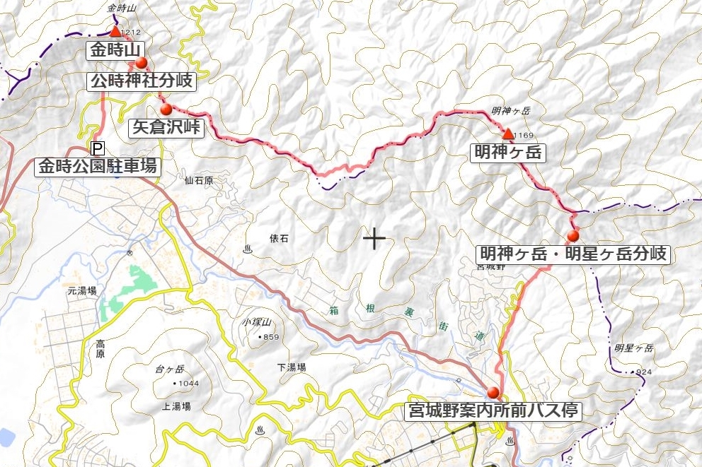 宮城野案内所前バス停 7:00 ⇒ 明神ヶ岳・明星ヶ岳分岐 8:10 ⇒ 8:55 明神ヶ岳 9:15 ⇒ 矢倉沢峠 11:10 ⇒ 公時神社分岐 11:30 ⇒ 11:55 金時山 12:40 ⇒ 公時神社 13:30 ⇒ 金時公園駐車場 13:35