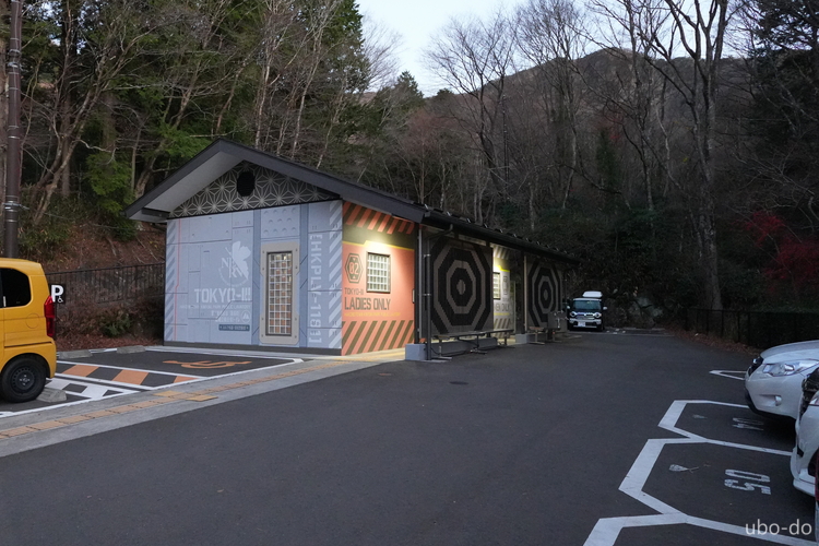 5時前に金時公園駐車場に着いたが、2~3台分しか空きがなかった。ちなみに金時公園のトイレは、エヴァンゲリオン側と作品の舞台である箱根町とのコラボレーションにより、エヴァ仕様になっている。