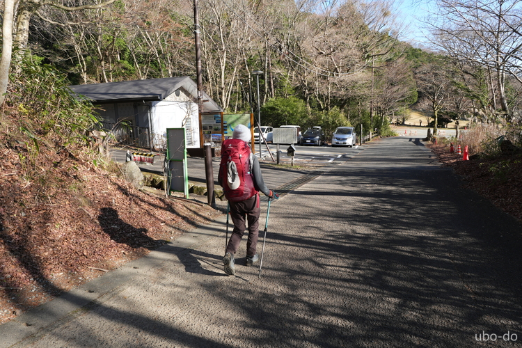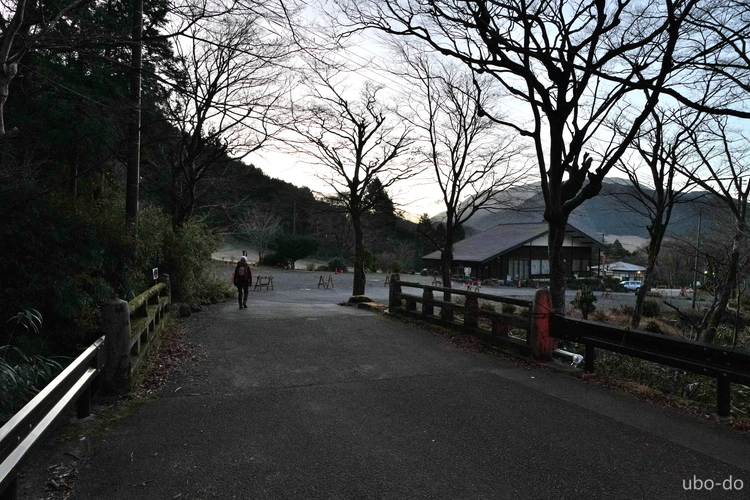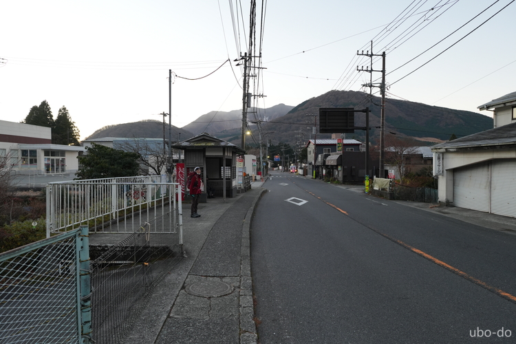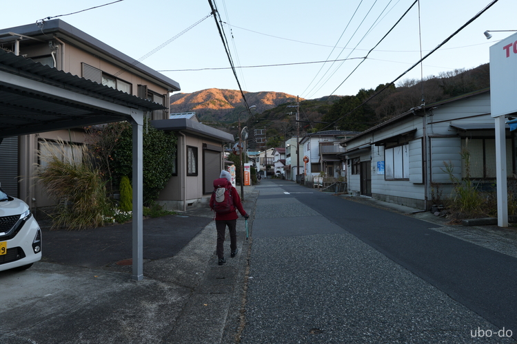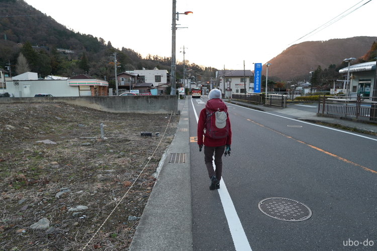 バス停近くのセブンイレブンに厚手の防寒靴下が売っていたので助かった。コンビニの前で購入した靴下を重ね履きして出発した。コンビニの背後に見えるのは明神ヶ岳。
