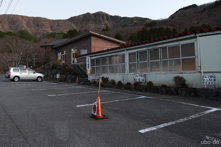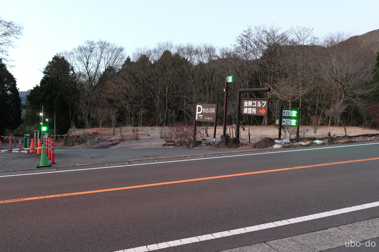 金時神社入り口にある金時ゴルフ練習場。公時神社側の方に登山者も停められる有料駐車場 (500円/1日) がある。
