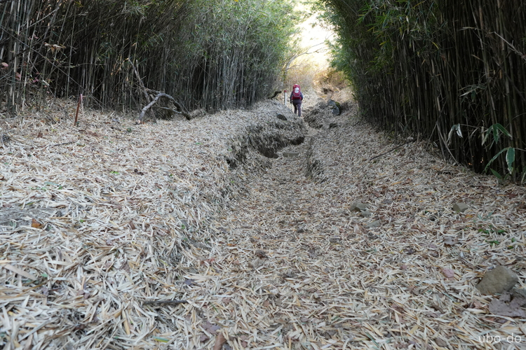 堆積したハコネダケの落ち葉。ハコネダケが覆いかぶさってトンネルのようになっている場所もあった。