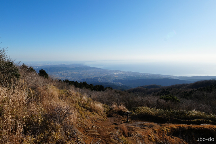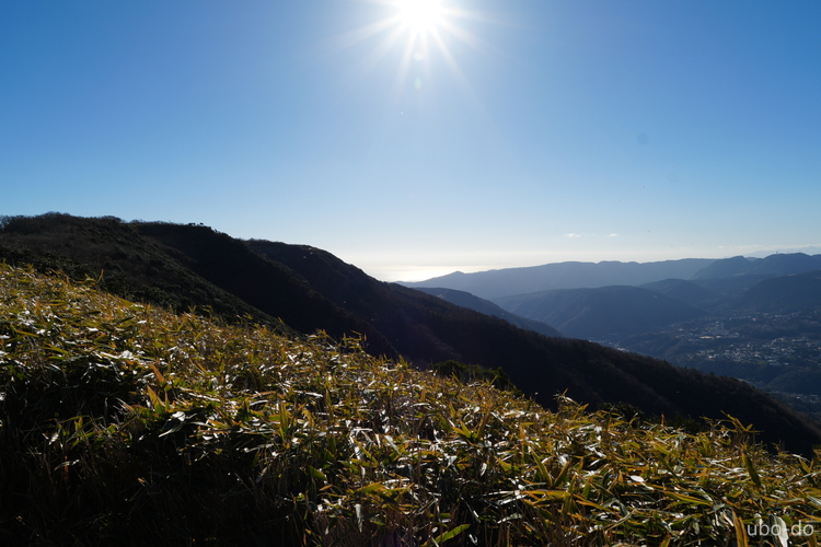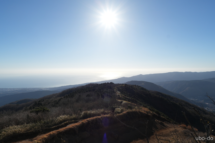 南南東には歩いてきた稜線と明星ヶ岳の山頂部が見えた。その先は陽光に輝く相模湾。