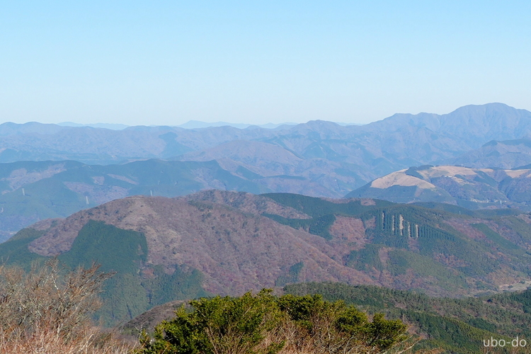 北北西の三ツ峠山 (左) と御正体山 (真ん中) 。御正体山の左奥は金峰山や国師ヶ岳、右奥には甲武信ヶ岳や大菩薩嶺も見えていた。