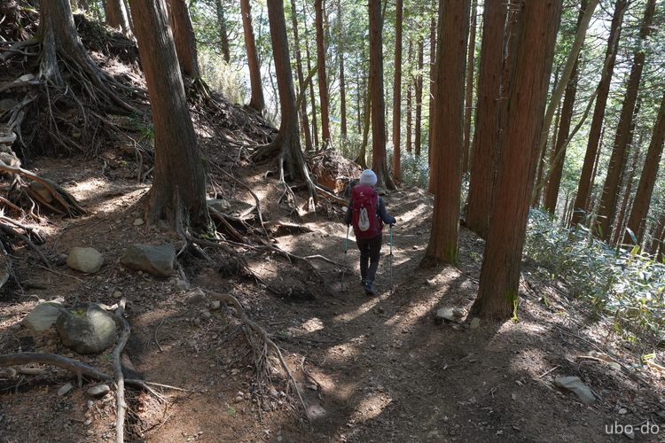 一気に下って林道を横切った。途中、公時神社奥の院入口があったが、通路が大雨で一部流失と掲示されており、どんな感じか少し先へ進んでみたところ、確かに道が荒れていたのでスルーした。