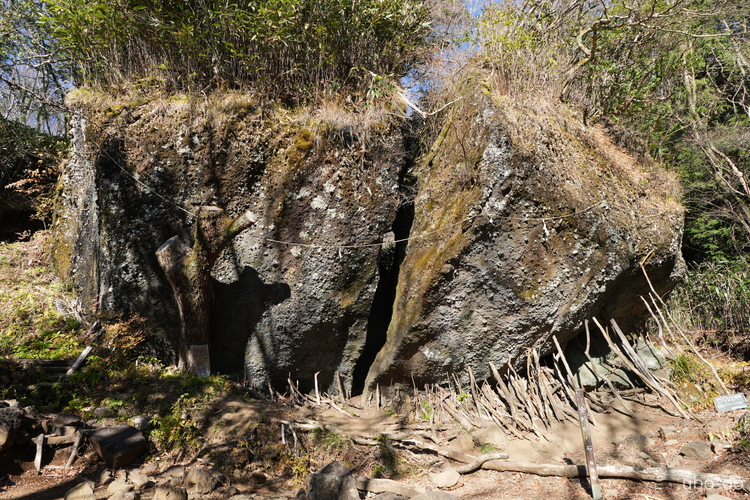 坂田公時 (金太郎) と祖母が、夜露をしのいだと云われる「宿り石 (やどりいし)」。金太郎が割ったわけではなく、1931年 (昭和6) に突然割れたらしい。