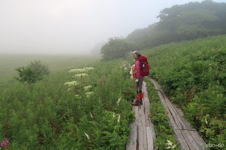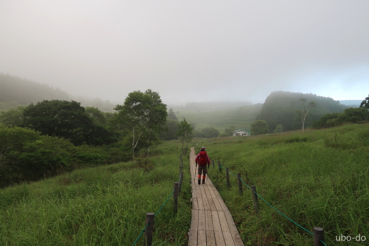 早朝の八島ヶ原湿原は霧で真っ白。湿原の南側、右へ進んだ。