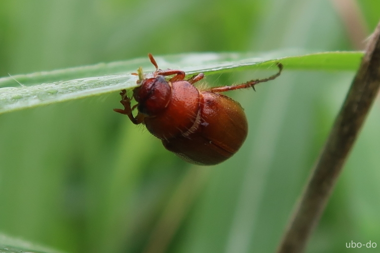 コガネムシ科のアカビロウドコガネ。何かいないか葉っぱの上を探しながら歩いていると、鮮やかな赤色の小さなコガネムシを見つけた。