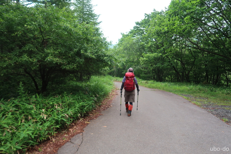 蓼科山をバックに広い砂利道を上る。