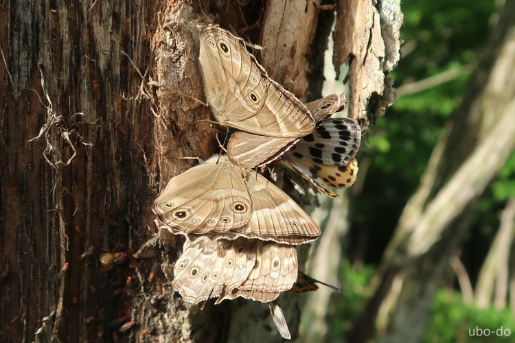 コナラの樹液にクロヒカゲやヒョウモンエダシャクなどが群がっていた。クワガタなどがいないかと、しばらく周囲を探したが、甲虫はいなかった。