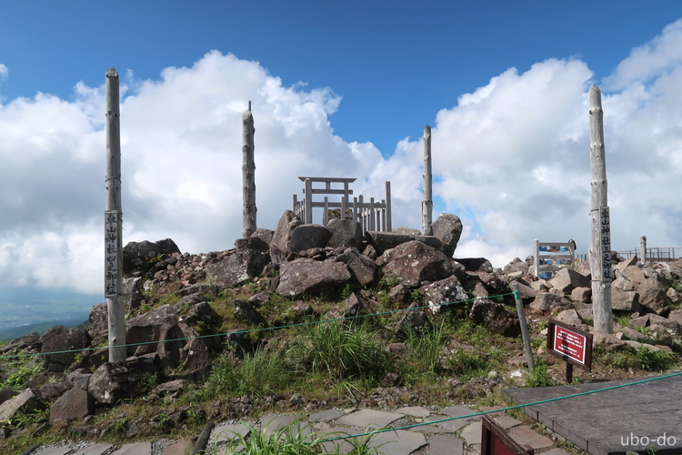 山頂に鎮座する車山神社。神社を囲む4本の御柱は、諏訪大社の御柱祭と同じ年 (寅と申の年) に行われる「天空の御柱祭」と呼ばれる車山御柱祭で、麓から引っ張り上げられる。