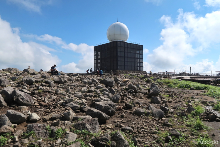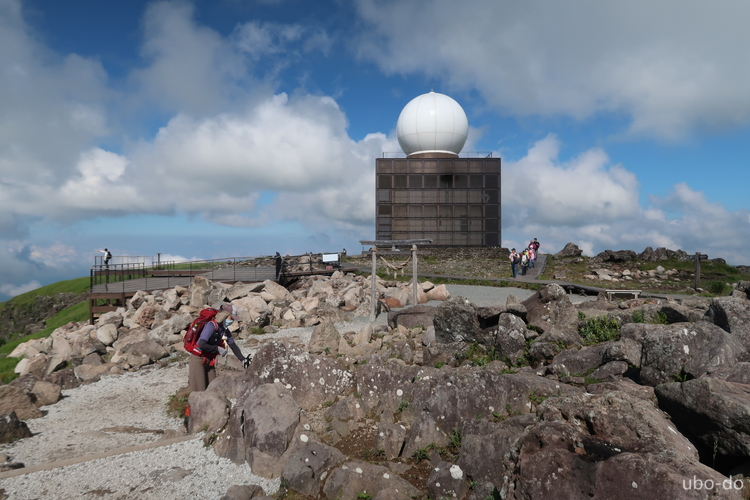 西側から眺めた車山気象レーダー観測所。山頂は広いので人が多くても気にならない。