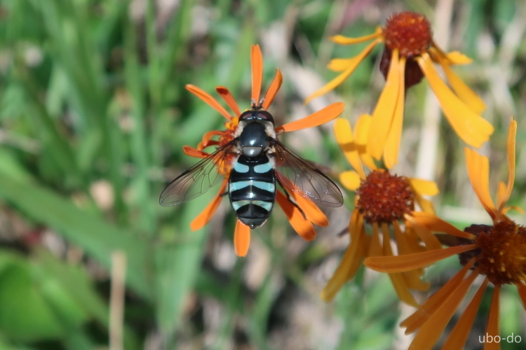 コウリンカで吸蜜するハナアブ科のヘリヒラタアブ。