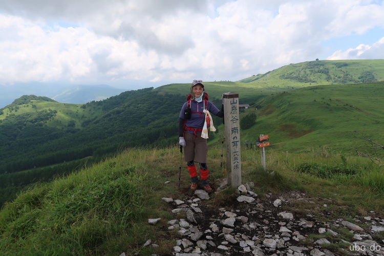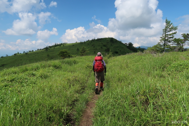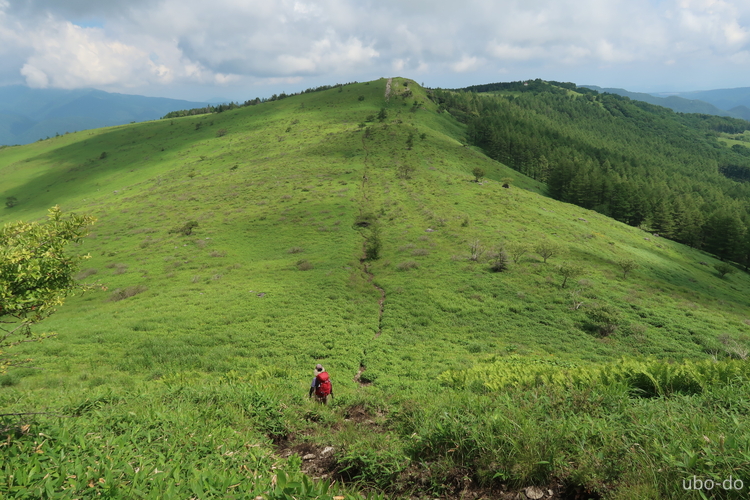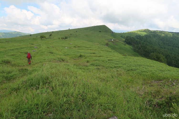 再びゆるやかに上り返す。背後に南の耳、北の耳、車山が並ぶ。