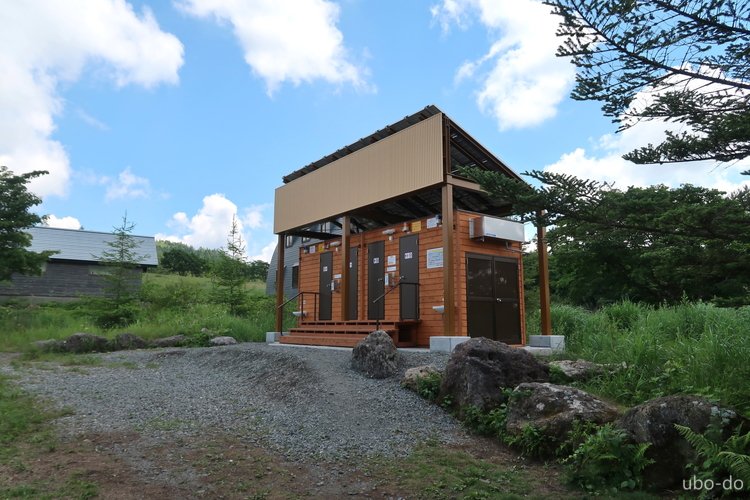 鎌ヶ池キャンプ場跡(奥霧小屋)の立派なトイレ棟。湿原内に入ると、団体客などで一気に人が増えた。