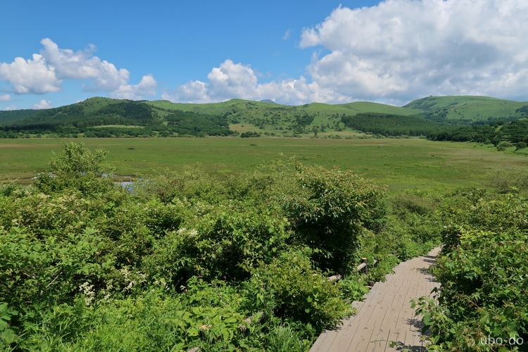 木道から眺めた湿原と鎌ヶ池。