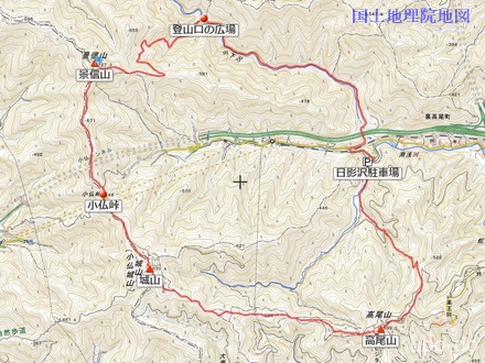 日影沢P 5:35 ⇒ 日影沢キャンプ場 5:55 ⇒ 6:45 高尾山 6:50 ⇒ 一丁平 7:40 ⇒ 8:20 小仏城山 8:30 ⇒ 小仏峠 8:50 ⇒ 9:30 景信山 10:00 ⇒ 登山口の広場 11:00 ⇒ 日影沢P 11:55