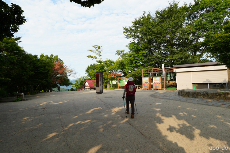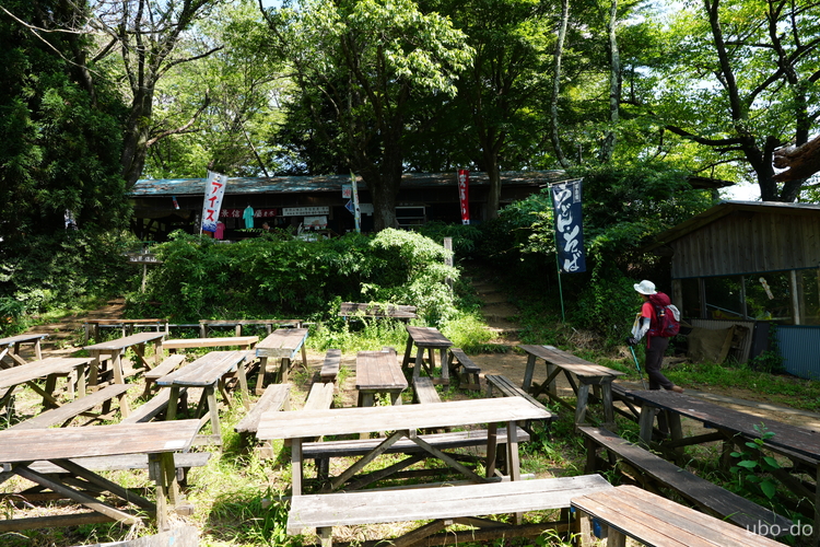 茶屋の奥にある山頂標で記念撮影。