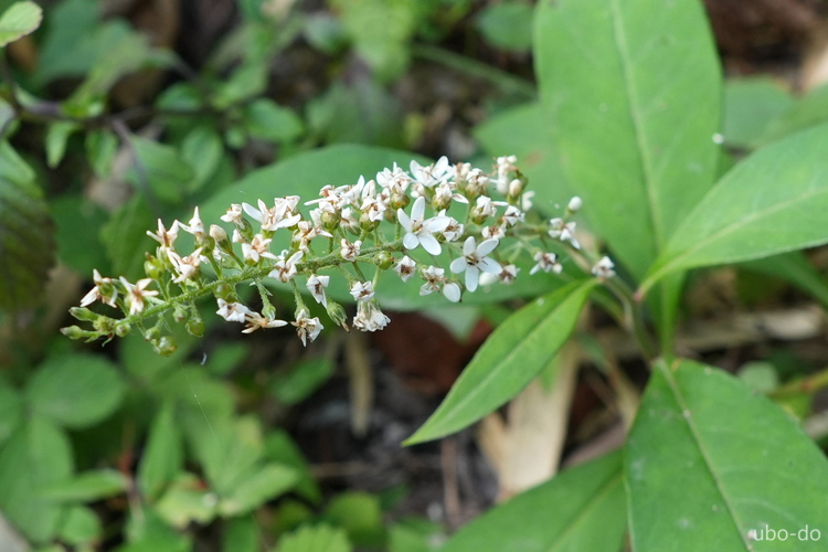 ハエドクソウ。全草に有毒成分あり。根の汁からハエ捕り紙を作ったことが名の由来。1科1属1種で果実に種が1つという特徴がある。
