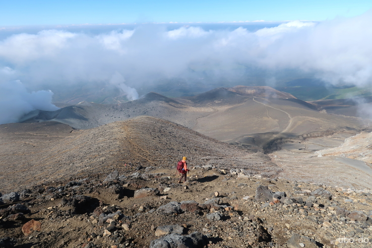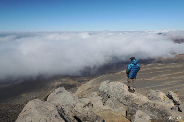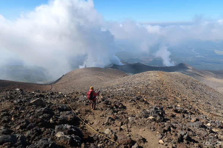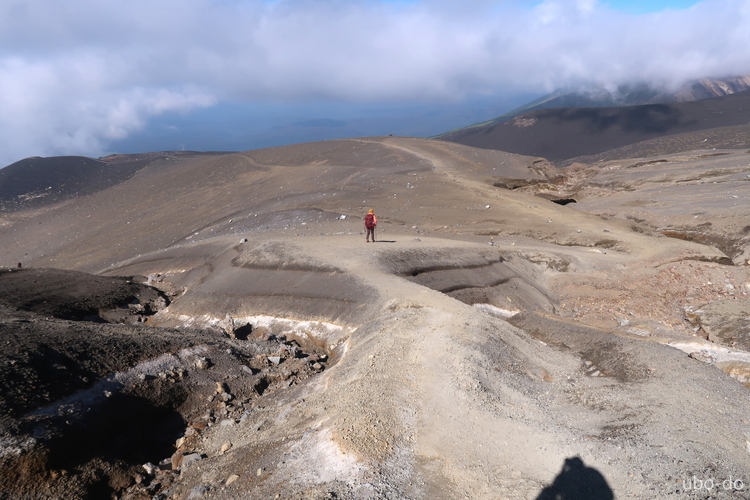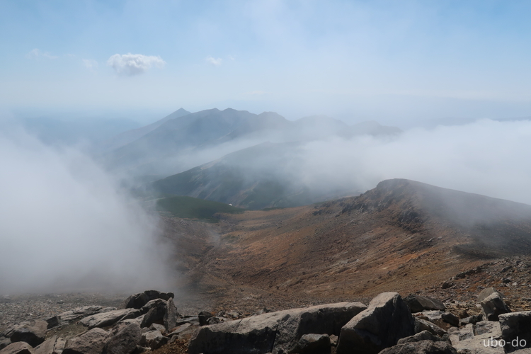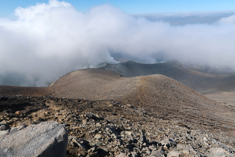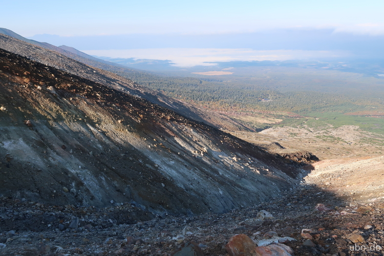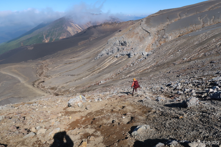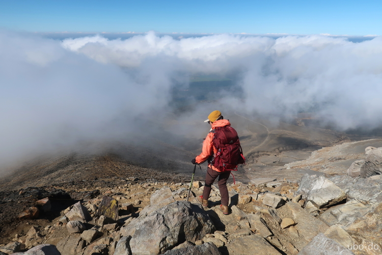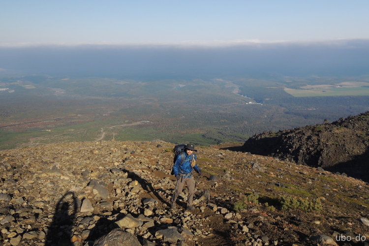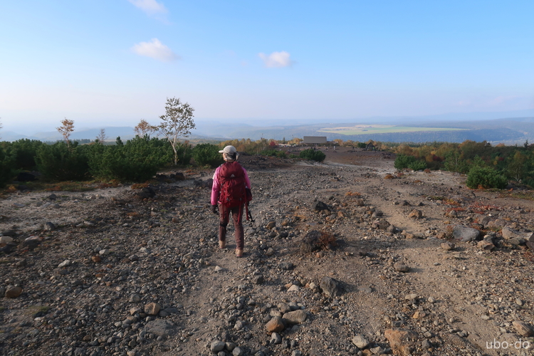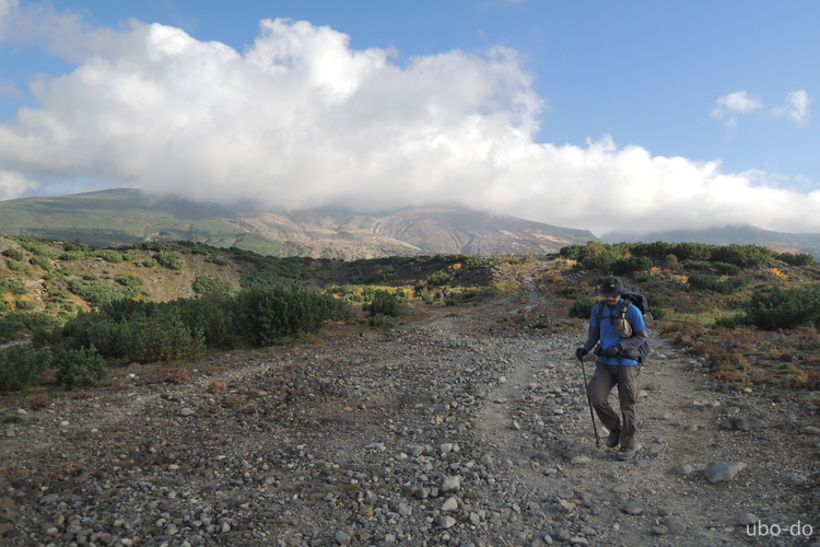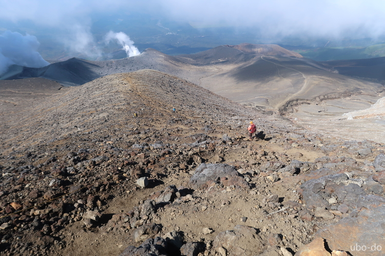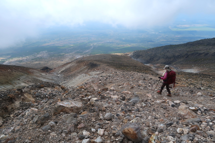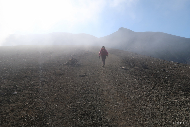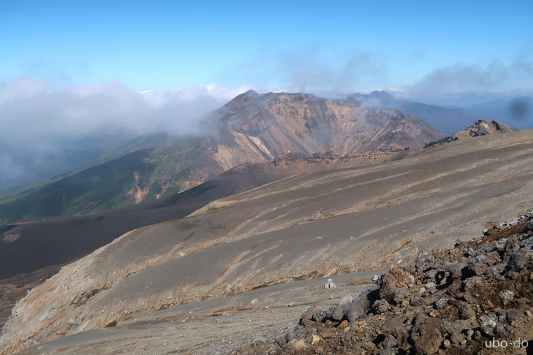 遠くなる十勝岳の山頂。上りではこの辺りから霧で何も見えなかった。