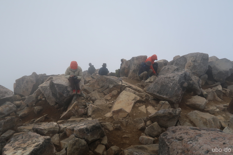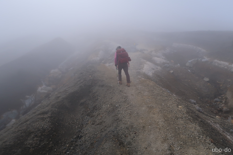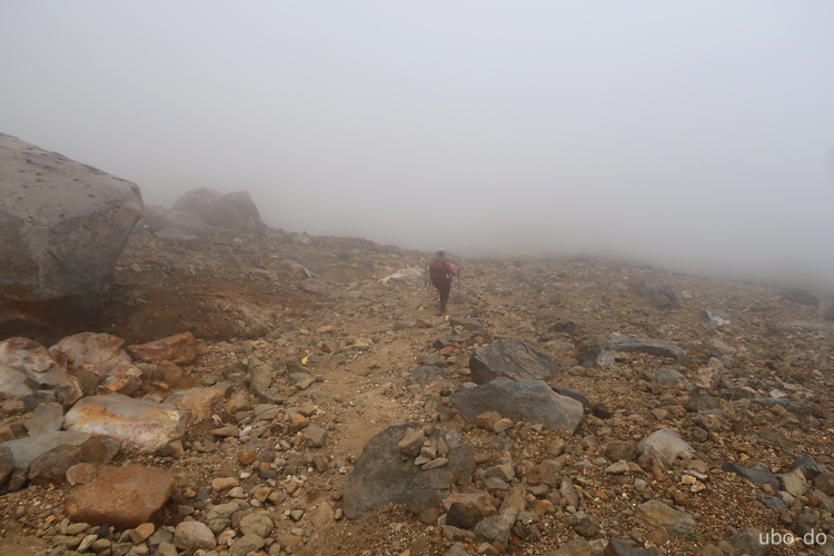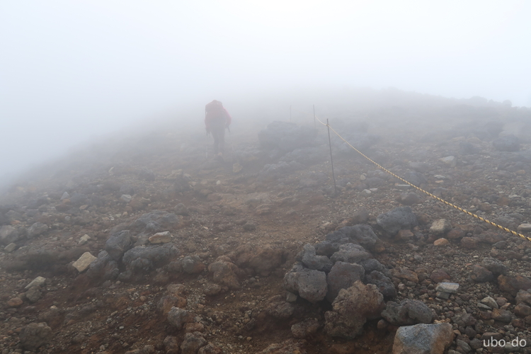 視界不良の中を上っていく。目印や踏み跡がしっかりしているので迷う危険性はなかった。