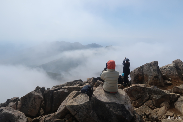 自分でも信じがたいことだが、山頂でナキウサギを見た(と思う)。すぐ数メートル先で2度も見かけたので、まず間違いないと思う。小さなネズミほどのサイズだったが、すぐ岩の隙間に逃げてしまったので写真を撮る時間はなかった。私以外は誰も気づいていないようだったので、証拠となる写真を撮っておきたかったのだが…。何か違う小動物だった可能性もあるが、真相は分からないままとなってしまった。