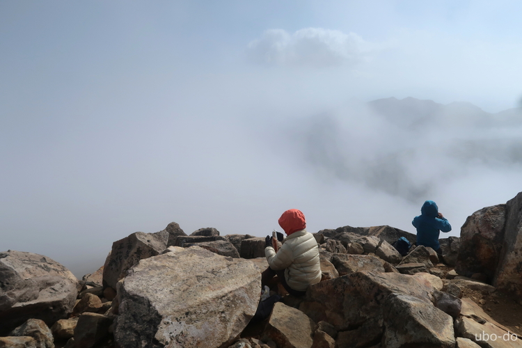 ガスが薄くなって山影が見えてくると、皆一斉にカメラや携帯を向けるが、あっという間にガスってしまう。
