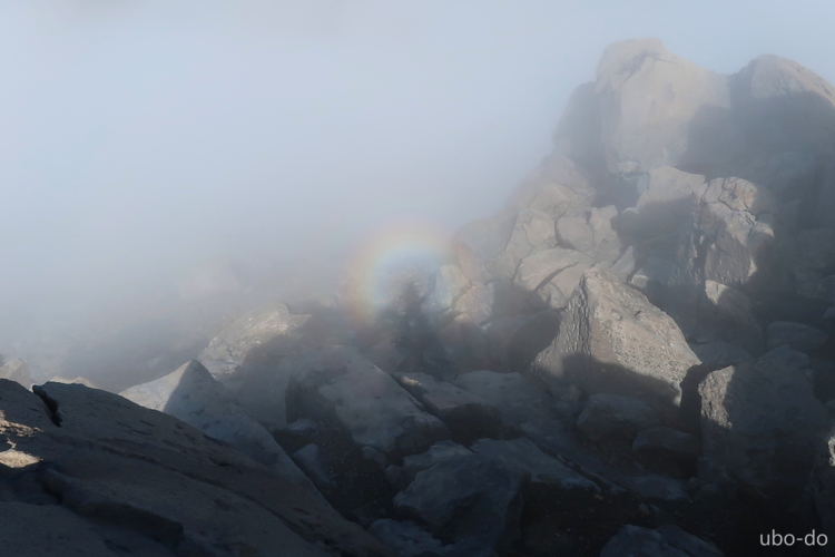 たまに顔を出す太陽を背にして立つと、西側の霧にブロッケン現象が見られた。