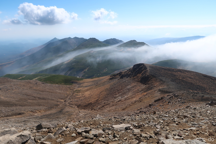 北東側の眼下には火山砂礫の台地が広がっていた。その向こうに石狩岳などの山並みが見えた。