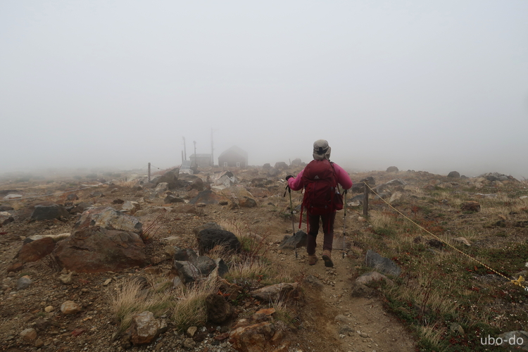 十勝岳避難小屋の手前で再び霧が出てきた。