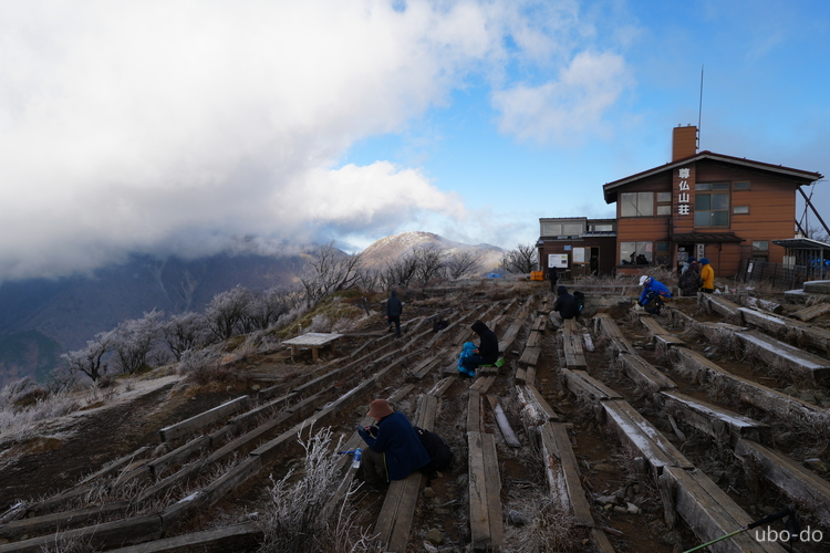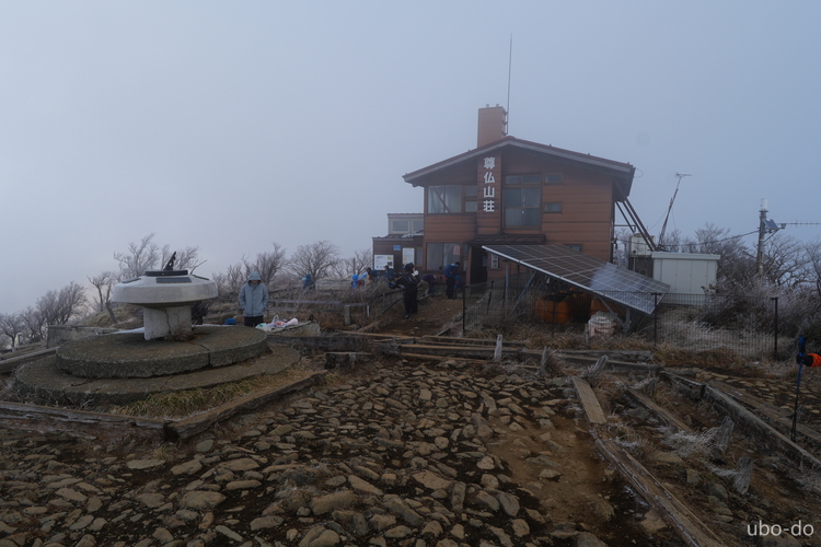 ガスに覆われた塔ノ岳山頂。妻によると山頂標の温度計はマイナス3度を指していたらしいが、体感温度はもっと低い感じだった。