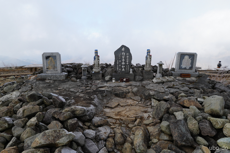 山頂標の隣に鎮座する狗留尊仏 (くるそんぶつ) 如来像。