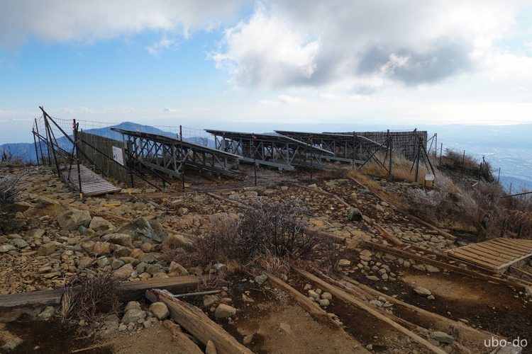 前回登った2019年にはなかったソーラーパネルが設置されていた。電源確保の必要はよく分かるが、相模湾を眺める山頂南側の特等席ですよ。景観という視点から違う場所の選択肢はなかったのだろうか。