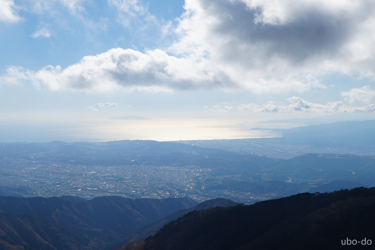 南側には陽光に輝く相模湾。海上に浮かぶ三原山や真鶴岬がよく見えていた。