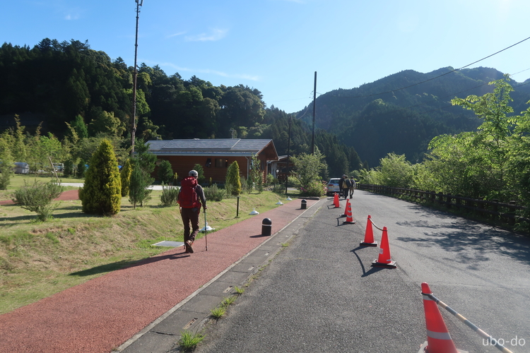 登山者用の駐車場を出発。さわらびの湯周辺はグランピングなどの施設ができていた。
