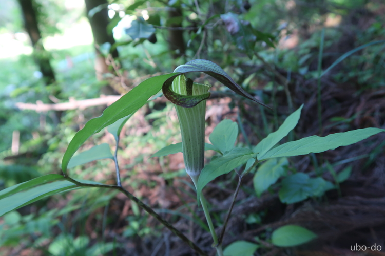 ミミガタテンナンショウだろうか。テンナンショウ類は同定が難しい。コース脇の日影に数輪咲いていた。