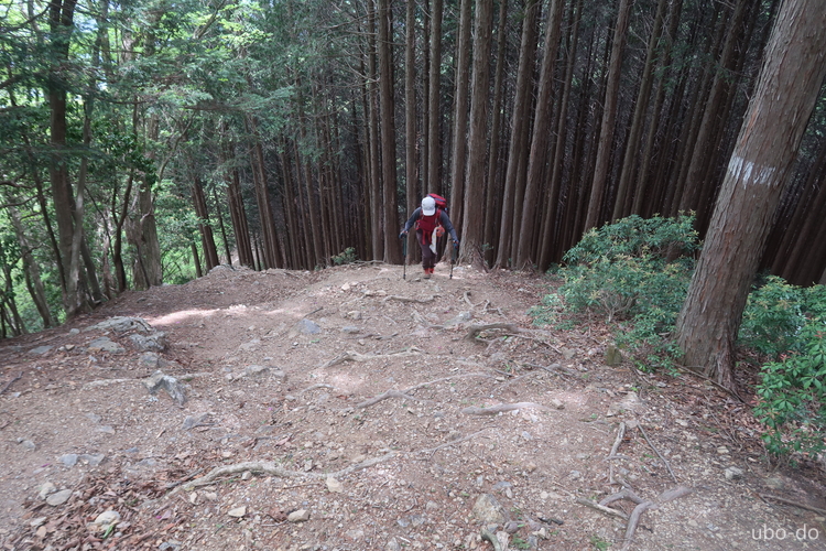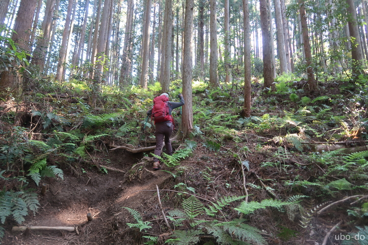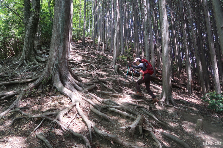 木の根がむき出しの坂を上る。