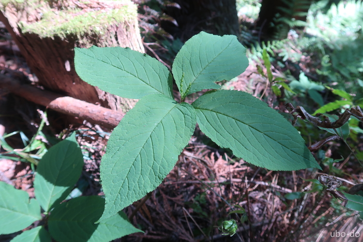 ヤブレガサ。名前の由来どおりに破れた傘のようだ。