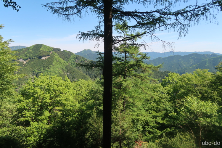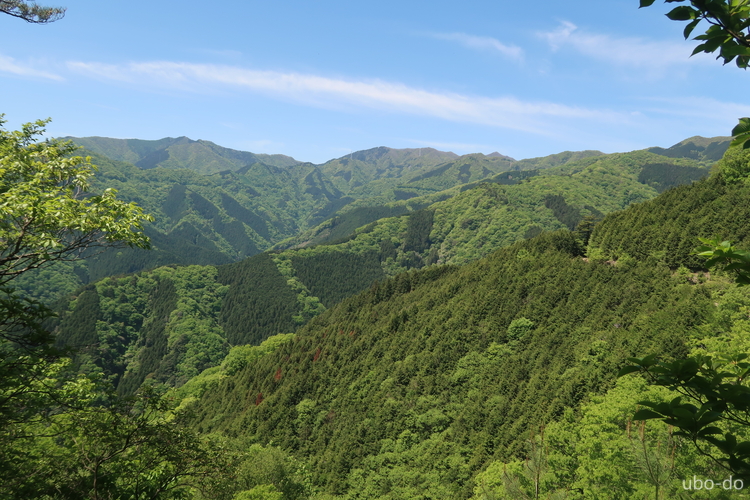 樹間から見えた西側。左は川苔山、中央は日向沢ノ峰、その左に蕎麦粒山、右端に有間山も見える。